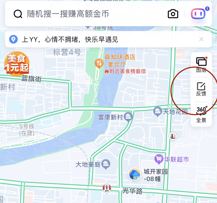 第一步:点击百度地图首页右上角的:“反馈”